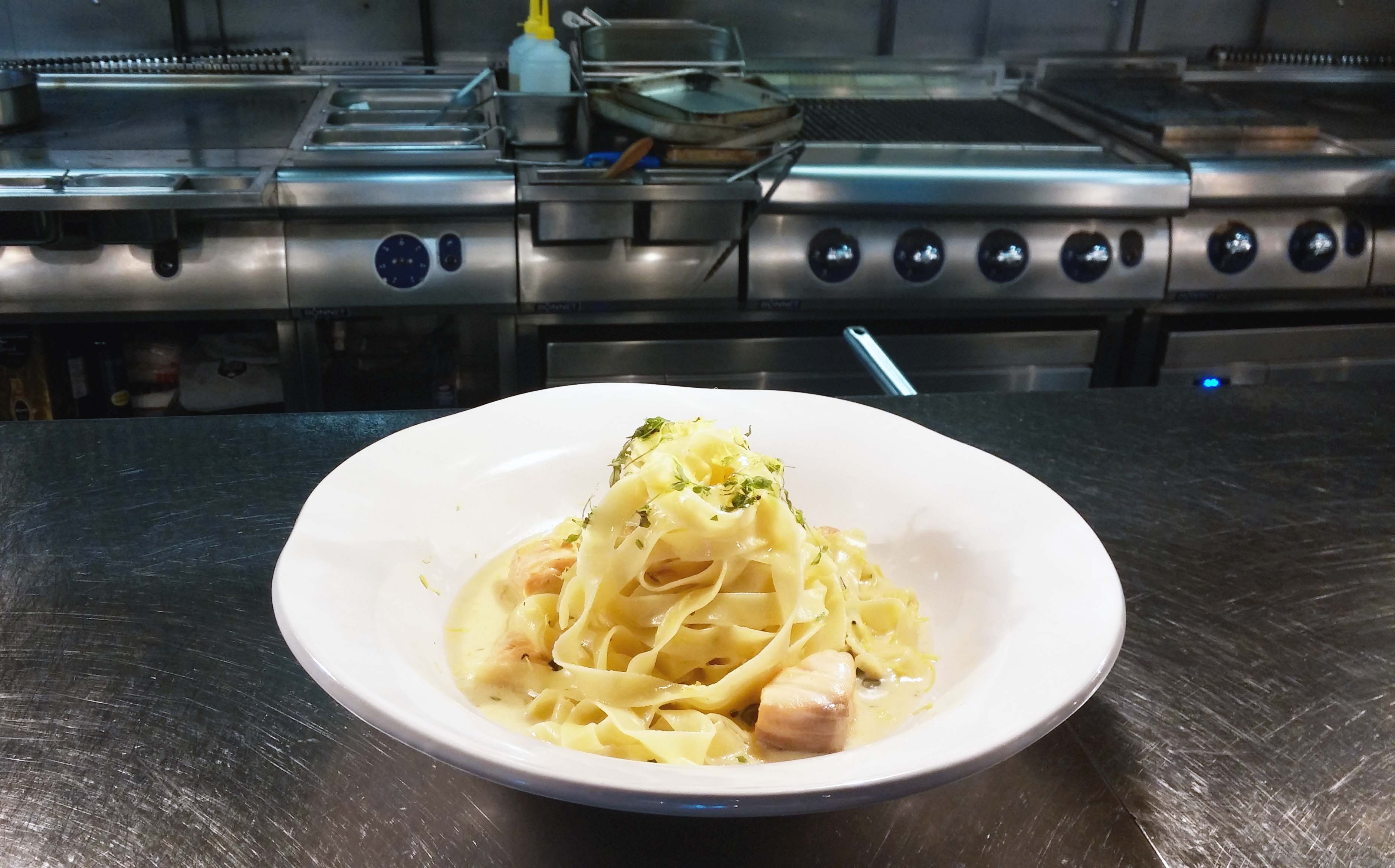 Somonlu tagliatelle mutfaktaki ilk çalışmam. Tabağa bu şekli vermek için makarnayı koyduktan sonra ortadan bir çatal batırıp doluyorsunuz. Sonra çatalı yavaşça dik bir şekilde havaya kaldırıp ve makarnanın yavaşça çataldan dökülmesini sağlıyorsunuz.
